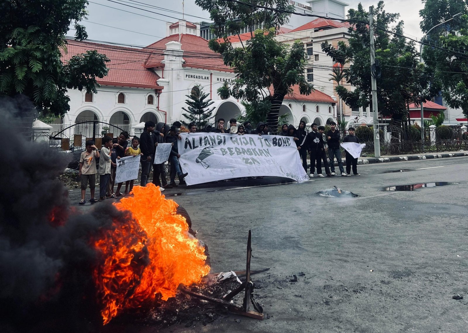Aksi tersebut merupakan bentuk protes terhadap tuntutan dua tahun penjara yang diajukan Jaksa Penuntut Umum (JPU) terhadap Zyair Musyaitir (ZM), mahasiswa asal Kabupaten Bone, dalam perkara dugaan pembakaran Gedung DPRD Kota Makassar.